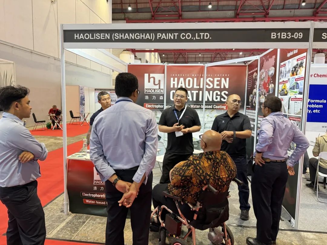 展會期間,浩力森展位人流如織,吸引了來自印尼、馬來西亞、泰國、越南等國家的專業(yè)觀眾駐足交流。現(xiàn)場展示的產(chǎn)品,憑借其低VOC、高耐候性及綠色環(huán)保特性,受到眾多客戶的青睞。浩力森技術(shù)團隊與來訪客戶深入探討行業(yè)痛點及應(yīng)用場景,針對東南亞市場的高溫高濕環(huán)境需求,提供了定制化的涂裝解決方案。